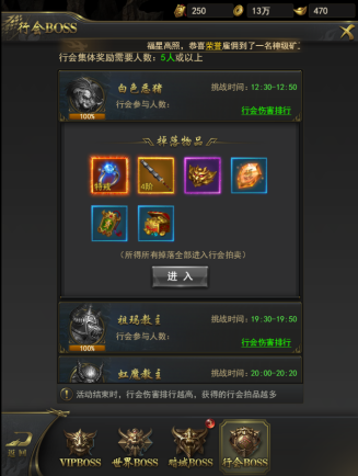 3、行会BOSS的道具奖励被拍卖后,所得利润将有参与击杀BOSS的行会成员平分。